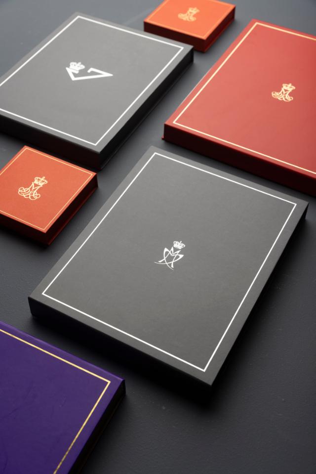 Magnetæsker i forskellige farver, hvor logoerne er lavet i enten guld- eller sølvfolie.